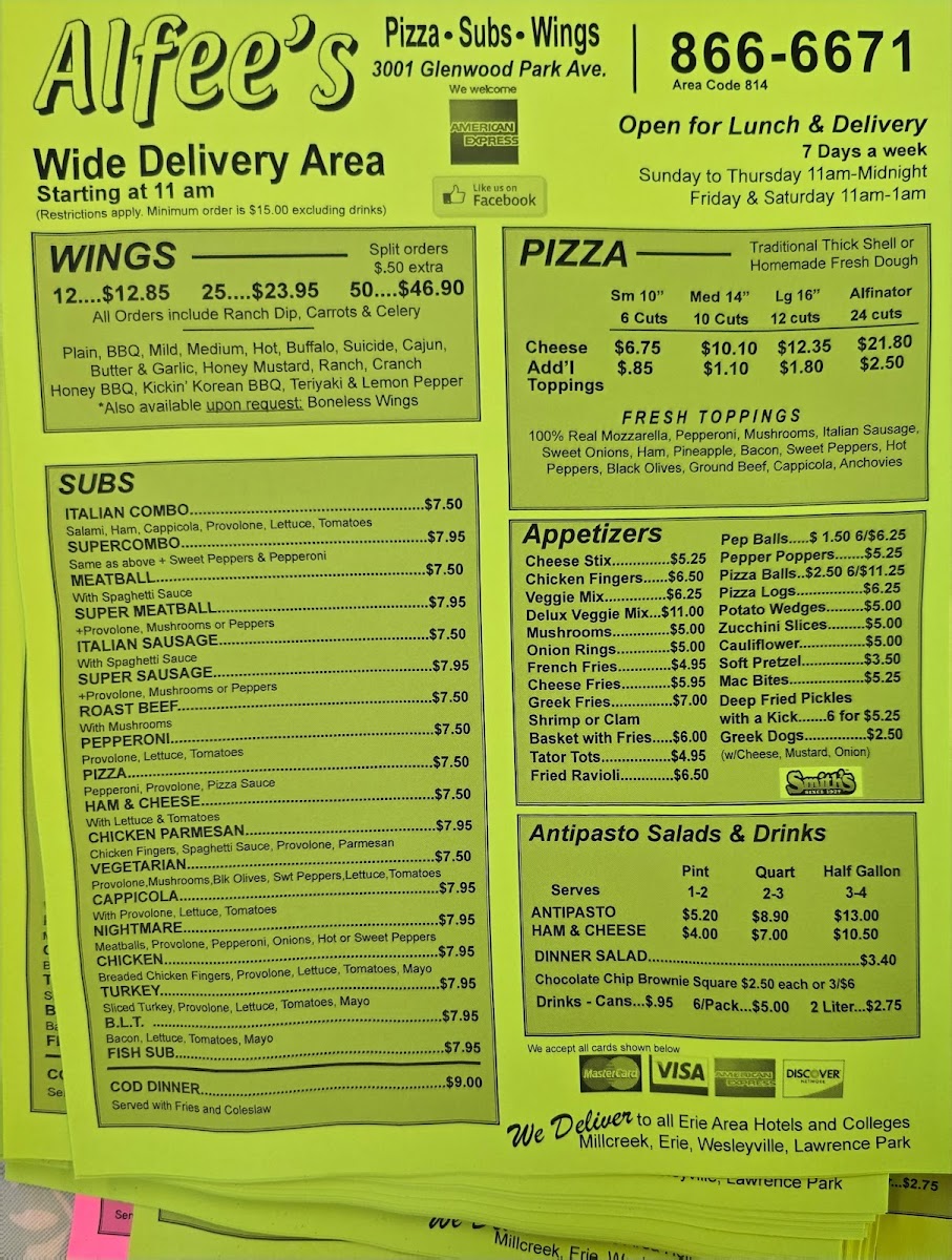 Alfee’s Pizza offers a straightforward and inviting menu centered around comforting, casual bites perfect for sharing or enjoying solo. The menu highlights include crispy chicken wings in various flavors like Honey BBQ Cajun Ranch, classic pepperoni pizza, and hearty subs such as the Italian Combo. These choices make it easy to grab a satisfying meal whether you’re stopping by for a quick lunch, ordering delivery for a relaxed evening at home, or grabbing takeout to enjoy with friends.